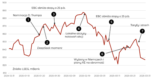 Niech za motyw przewodni podsumowania pierwszego kwartału posłuży nam kąt 180⁰ stopni, inaczej zwany kątem półpełnym (ach te łamańce polskojęzyczne). Konia z rzędem temu, kto by się spodziewał i przygotował do spektaklu jaki obserwowaliśmy w pierwszych trzech miesiącach tego roku. A działo się wiele. Głównym aktorem okazał się być prezydent Stanów Zjednoczonych rozgrywający thriller na scenie geopolitycznej. Przypomnijmy, że po wyborze na ponowną kadencję D. Trumpa inwestorzy giełdowi zareagowali dosyć pozytywnie. Kalkulacje były proste, akcje amerykańskie utrzymają swoją „wyjątkowość” napędzane kontynuacją trendów AI, hossa rozleje się na mniejsze, amerykańskie podmioty, korzystające ze wsparcia rynku lokalnego. O pogrążonej w letargu Europie należało zapomnieć. Taryfy miały doprowadzić do umocnienia dolara, co byłoby niekorzystne dla krajów z rynków wschodzących i partnerów handlowych. Obawy o inflację miały hamować Fed przed obniżkami stóp procentowych i trzymać ceny obligacji na niskich poziomach.