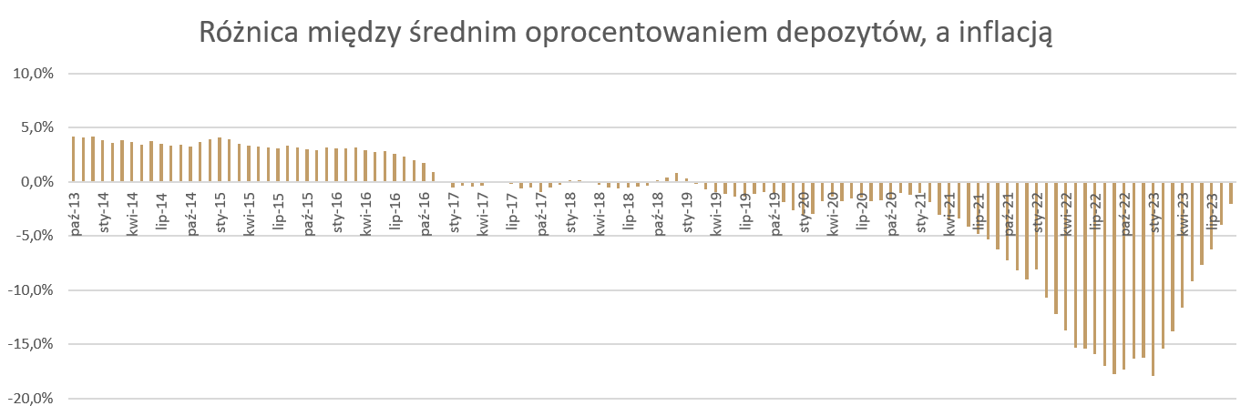 Jak widać, już od prawie 7 lat mamy do czynienia z sytuacją, w której lokaty albo z trudem pokrywają inflację, albo zdecydowanie nie dotrzymują jej kroku. Dane miesięczne wskazują, że w ciągu ostatniej dekady, po uwzględnieniu spadku siły nabywczej pieniądza, depozyty przynosiły oszczędzającym realną stratę przez 62% czasu. Jak dużą stratę? Gdyby pierwszą lokatę otworzyć w październiku 2013 r. i odnawiać je przez 10 lat, łączna realna strata, wyniosłaby 16%. W najgorszych miesiącach, utrata realnej wartości kapitału sięgała aż 18% w skali roku. Co ważne, powyższe obliczenia nie biorą pod uwagę podatku od zysków z lokat. Po jego uwzględnieniu, dane wyglądałyby jeszcze gorzej.