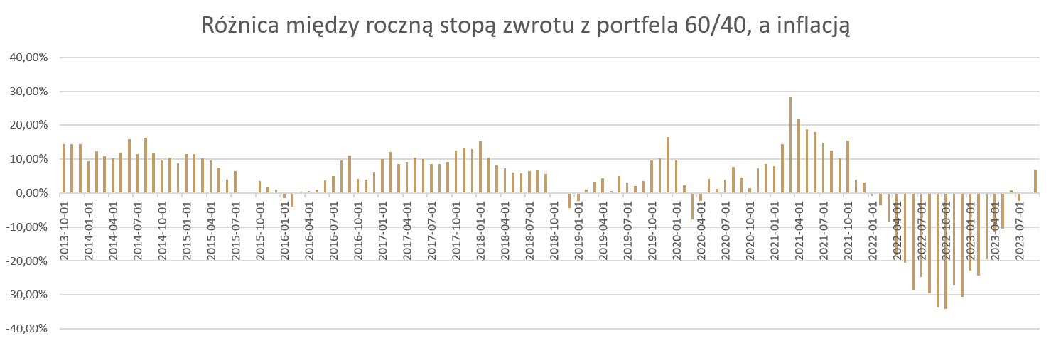 Po dekadzie walki z inflacją, nasz hipotetyczny inwestor z przeszłości, kończy bitwę z tarczą, a nie jak w przypadku lokat – na tarczy. Portfel inwestycyjny przyniósł mu 32% realnego zysku. Co jednak bardziej zaskakujące, okazuje się że tylko przez 23% czasu, zyski z inwestycji nie były w stanie pokryć inflacji. W ponad ¾ przypadków, klasyczny portfel 60/40 z nawiązką nadrabiał utratę siły nabywczej.