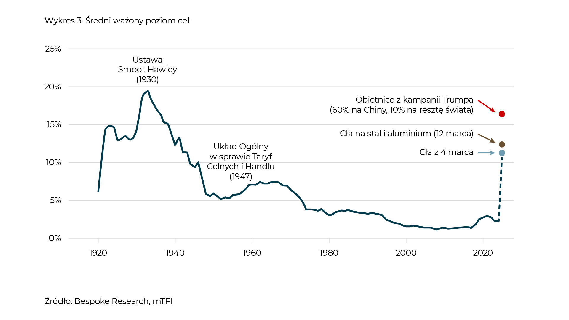 Z kolei po II wojnie światowej podpisany został Układ Ogólny w sprawie Taryf Celnych i Handlu (ang. General Agreement on Tariffs and Trade, czyli GATT), który był prekursorem Światowej Organizacji Handlu (WTO). Generalnie zatem zbliżamy się do stulecia coraz niższych ceł i – jak pokazuje wykres powyżej – Donald Trump stwierdził, że wystarczy.