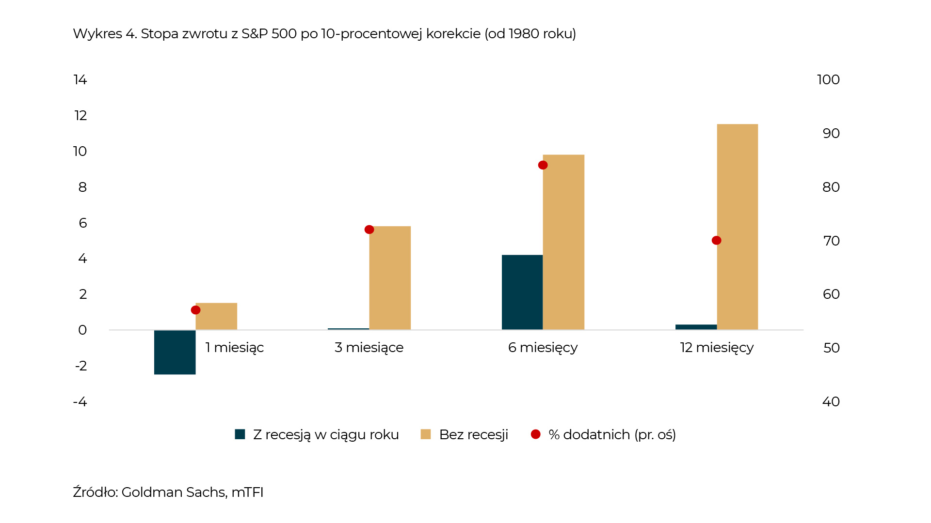 Wszystko to, co napisaliśmy powyżej, jest raczej negatywnym tłem dla rynków akcji. Na marginesie, w grudniu sugerowaliśmy, że jednostronny konsensus może się mylić, redukując ekspozycję na aktywa ryzykowne. Pamiętajmy jednak, że nagłówki i polityka to nie są jedyne elementy wpływające na wyceny. Nie wydaje nam się, żeby to już był moment, aby odważnie przeważać akcje, a wręcz widzimy powody do zachowania dalszej ostrożności. Niemniej – jak zawsze w takich przypadkach – lubimy przytaczać historyczne statystyki. A okazja ku temu jest dość dobra, ponieważ S&P 500 oficjalnie zaliczył 10-procentowy spadek od szczytu.