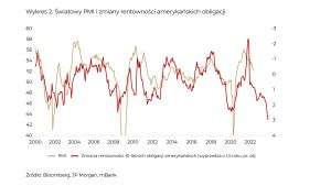 w fazę spowolnienia, czego wyrazem były kłopoty spółek deweloperskich w 2021 roku. Wskaźnik PMI dla Chin znajduje się na jednym z najniższych poziomów w historii – wyprzedzają go jedynie lata 2008/09 oraz pandemia. Rynek zdaje się nam przy tym mówić, że w gospodarce będzie tylko gorzej. Wykres 2 pokazuje poziom wskaźnika PMI dla świata, zestawiony z dynamiką zmian rentowności amerykańskiego długu.