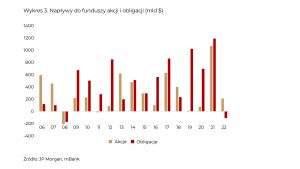 się na kupno obligacji. Tymczasem obecnie to rynek obligacji jest jednym z „winowajców” obaw o spowolnienie, więc historyczne zależności zawodzą. Na wykresie 3 pokazujemy wręcz, że w tym roku inwestorzy wycofywali pieniądze z rynku długu po raz pierwszy od 2008 roku. Z kolei, mimo balansowania na granicy oficjalnego „rynku niedźwiedzia”, akcje wciąż przyciągają swoich amatorów.