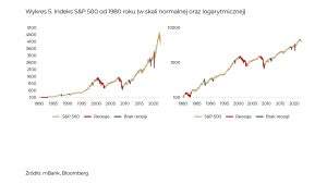 Jesteśmy w dość newralgicznym momencie. Co prawda w czasie pisania tego materiału indeks S&P500 nie zanotował jeszcze spadku o 20% od szczytu, ale różnica jest na tyle mała, że możemy już de facto mówić o „rynku niedźwiedzia”. Historycznie rzecz biorąc, odpowiedź na pytanie „co dalej” w dużej mierze zależała od tego, czy gospodarka wchodziła w fazę recesji, czy też nie. Spadki związane z recesjami są głębsze i dłuższe od tych, którym recesja nie towarzyszy. Oba te przypadki dla okresu