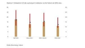 Jak czytać ten wykres? Pionowe linie to najwyższe i najniższe poziomy wskaźnika Cena/Zysk dla poszczególnych indeksów od 2010 roku, z zaznaczonym średnim poziomem. Z kolei słupki to obecne poziomy wycen. Owszem, nie są najniższe w historii, ale – tak jak wspomnieliśmy – firmy nie zasypiają gruszek w popiele i wciąż generują pokaźne zyski.