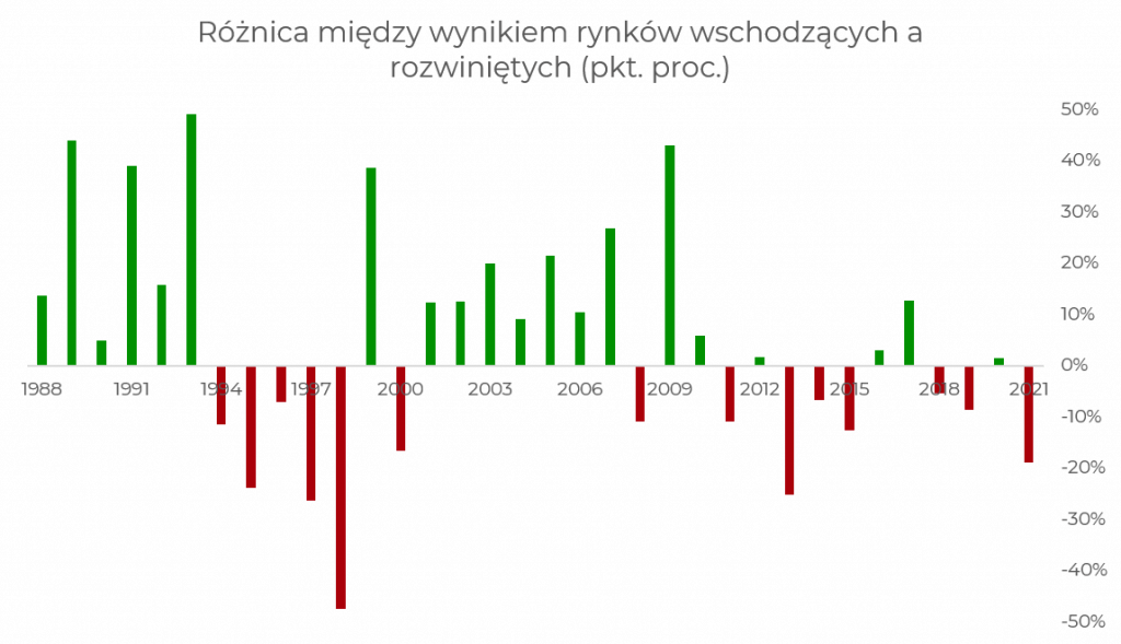 Różnica na niekorzyść rynków wschodzących sięga niemal 20%. Ostatnio podobna sytuacja miała miejsce w 2013 roku, a wcześniej trzeba by sięgnąć do końcówki ubiegłego wieku, kiedy to przez rynki wschodzące przetoczyła się fala kryzysów i bankructw (w szczególności Rosji w 1998 roku). Gdyby tak spojrzeć na 2021 rok nie znając poziomów indeksów giełdowych, zdziwienie takim wynikiem byłoby jeszcze większe. W 2021 roku światowa gospodarka dość szybko wychodziła z głębokiej recesji, najważniejsze banki centralne świata uporczywie ignorowały rosnącą inflację utrzymując stopy procentowe w okolicy zera, a programy luzowania ilościowego były kontynuowane. Wszystkie te czynniki powinny były skierować oczy światowych inwestorów na rynki wschodzące, zwłaszcza że jest to znakomity rok dla dostarczanych przez wiele z nich surowców. A stało się inaczej…