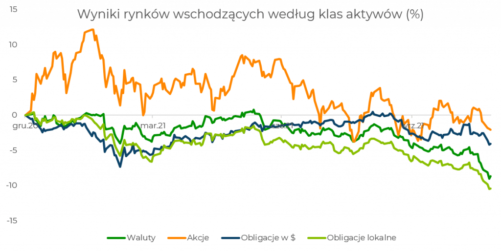 • Podwyżki stóp procentowych: o ile Fed czy Europejski Bank Centralny spokojnie podchodziły do kwestii inflacji, o tyle rynki wschodzące już nie miały takiego luksusu. W tym roku mieliśmy do czynienia już z ponad 80 podwyżkami stóp procentowych w krajach rozwijających się wobec 18 w krajach rozwiniętych (i to zwykle tych mniej istotnych dla globalnych rynków, jak np. Nowa Zelandia czy Kanada). Dla porównania w „covidowym” 2020 roku, banki centralne rynków wschodzących obniżyły stopy aż 188 razy. Tegoroczne podwyżki stóp uderzyły w rynki obligacji oraz obniżyły perspektywy dla tempa wzrostu gospodarczego.