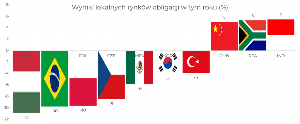 Nawet „pancerne” dotychczas obligacje krajów wschodzących emitowane w dolarach dość sporo straciły. A już najgorzej zachowywały się obligacje w walutach lokalnych, co było niestety również udziałem Polski (o czym za chwilę). Wybraliśmy 10 najważniejszych rynków obligacji krajów wschodzących, których wynik pokazujemy na wykresie poniżej:
