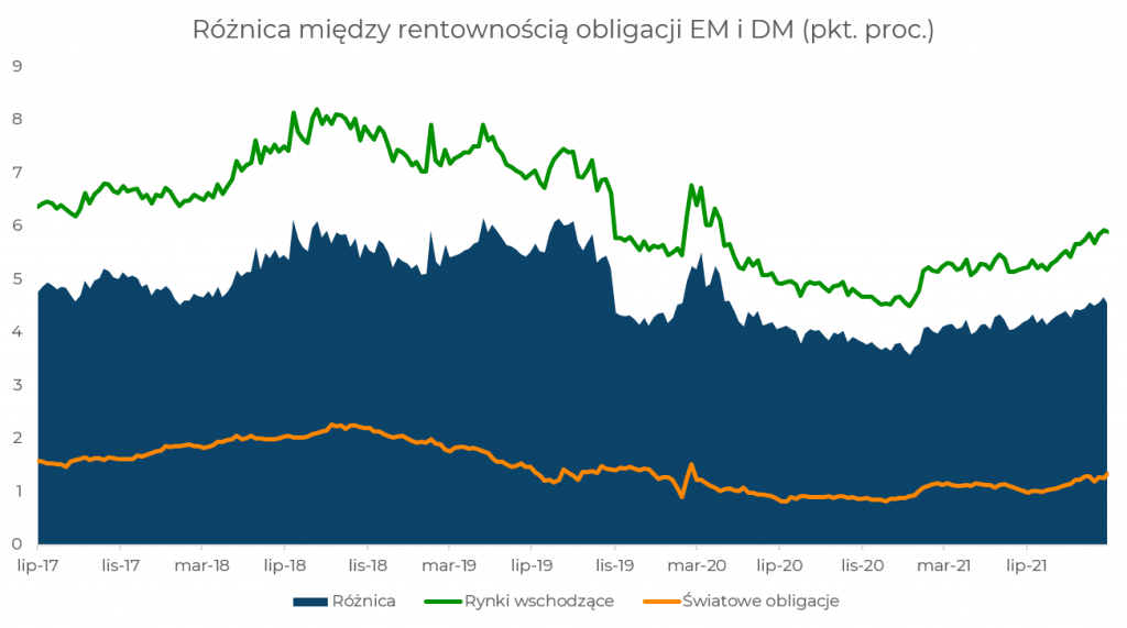 Wielokrotnie pisaliśmy, że sam fakt, że zmienia się kartka w kalendarzu z numerem roku nie musi oznaczać, że jakieś trendy się kończą, a rozpoczynają nowe. Przeciwnie, wielokrotnie widzieliśmy, że to co działało (lub nie!) w danym roku, działa (lub nie!) na początku kolejnego. Ot, taka natura inwestorów „goniących” historyczne wyniki. Problemem dla rynków wschodzących będzie ciągle zbliżające się wielkimi krokami zacieśnianie polityki pieniężnej w USA, nawet mimo wielkiej ostrożności Jerome’a Powella. Ale kilkadziesiąt podwyżek stóp procentowych, które wspomnieliśmy wcześniej, dostarczają rynkom wschodzącym nieco więcej amunicji. Wykres poniżej pokazuje różnicę w rentowności obligacji rynków wschodzących w stosunku do całego rynku.