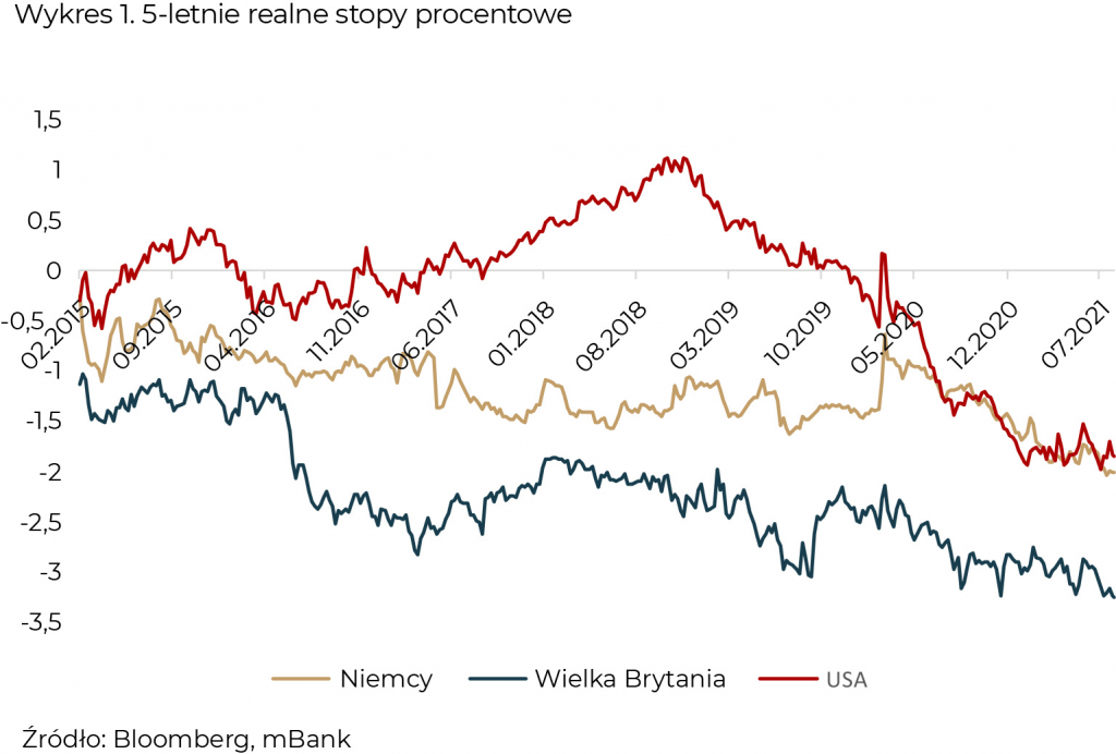 Jak widać w Niemczech (czyli ogólniej w strefie euro) i USA inwestorzy zakładają, że stopy procentowe będą o około 2 punkty procentowe niższe od inflacji przez najbliższe pięć lat. W Wielkiej Brytanii sytuacja jest gorsza, bo ta różnica rośnie do ponad 3 punktów procentowych na niekorzyść oszczędzających. Co to w praktyce oznacza? Otóż każde euro i każdy dolar będą za pięć lat realnie warte około 90 centów, a każdy funt około 85 pensów. W Polsce nie ma już 5-letnich obligacji inflacyjnych, z których można by taką informację wydedukować, ale 2-letnie obligacje indeksowane sugerują, że siła nabywcza złotego będzie spadać o około 3,5% rocznie. Swoją drogą i tak byłaby to poprawa w stosunku do sytuacji obecnej, w której inflacja jest ponad 5 punktów procentowych powyżej stopy referencyjnej NBP.