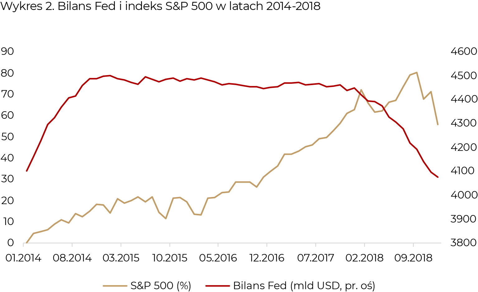 Dyskusje o wychodzeniu z luźnej polityki pieniężnej to nie jest żadna nowość w USA. Przecież programy luzowania ilościowego rozpętane na dobre w 2008 roku przez Bena Bernanke też w końcu się skończyły. W 2013 roku po raz pierwszy użył on słowa „taper” w kontekście ograniczania zakupów obligacji. Bilans Fedu przestał rosnąć w 2015 roku, kiedy osiągnął wartość 4,5 biliona dolarów (obecnie 8,3 bln). Pierwsza podwyżka stóp procentowych nastąpiła w grudniu 2015 roku i cykl zacieśniania trwał przez trzy lata kończąc na poziomie 2,5%. Mieliśmy zatem dziewięć podwyżek stóp procentowych. Jednocześnie w 2018 roku bilans Fedu zaczął się kurczyć, co miało związek z zapadalnością wcześniej zakupionych obligacji. Jak na to zareagował amerykański rynek akcji? Spójrzmy na wykres 2 poniżej.