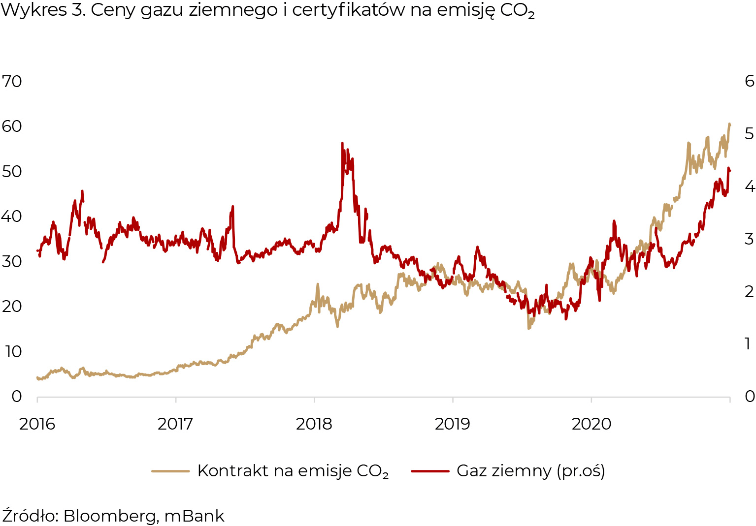 W związku z różnego rodzaju zawirowaniami natury gospodarczej, ale też pogodowej, w ostatnich miesiącach widzimy dość istotny wzrost cen energii. Widać to zwłaszcza dla cen węgla kamiennego i gazu ziemnego. Jednocześnie od wielu lat w Unii Europejskiej obowiązuje system handlu prawami do emisji CO₂. Ich ceny również poszybowały. Pokazuje to wykres 3 poniżej.