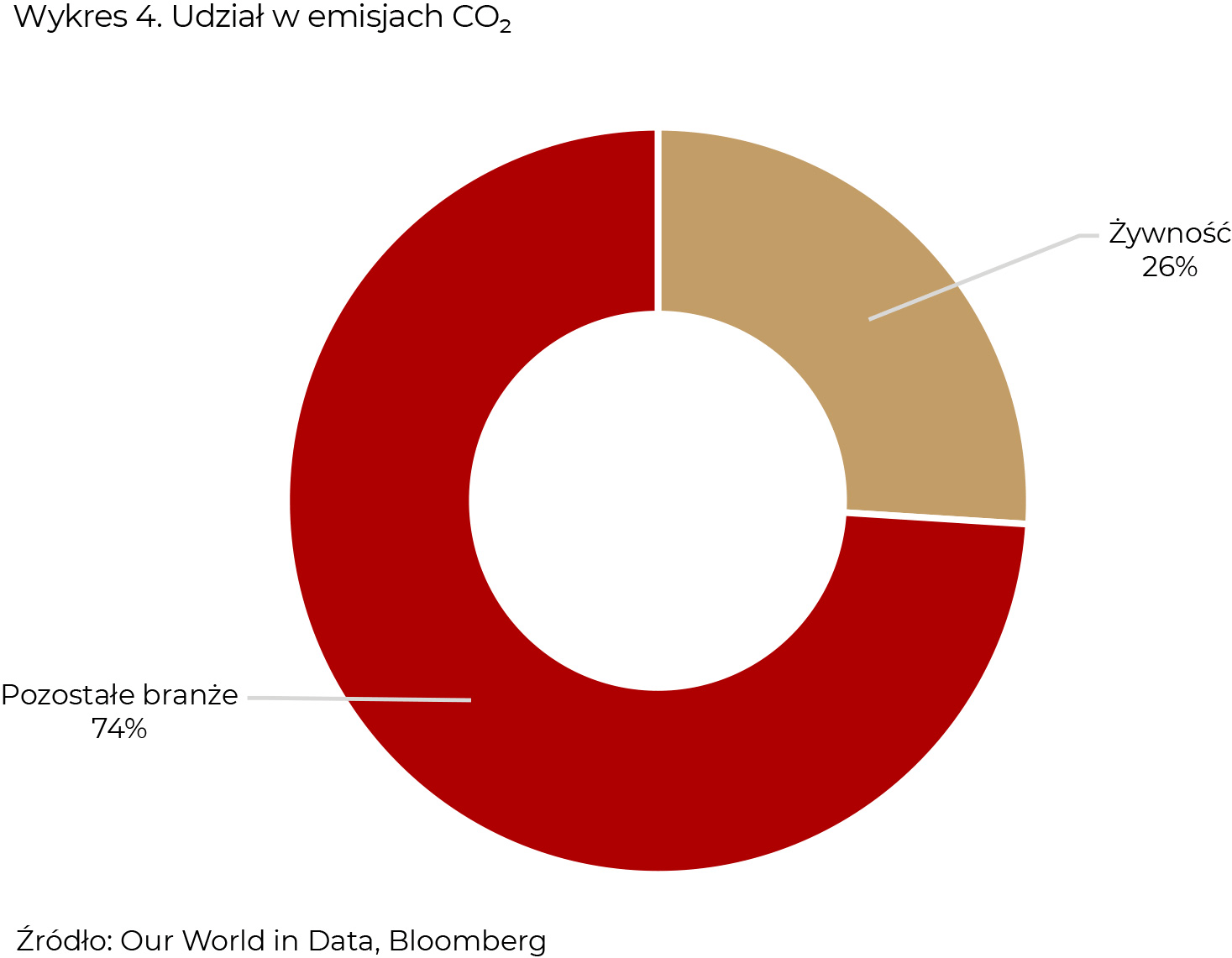 Emisje CO₂ związane z produkcją energii to oczywiście kluczowy czynnik, ale bynajmniej nie jedyny. Okazuje się, że za około ¼ emisji dwutlenku węgla odpowiada branża żywieniowa (wykres 4).