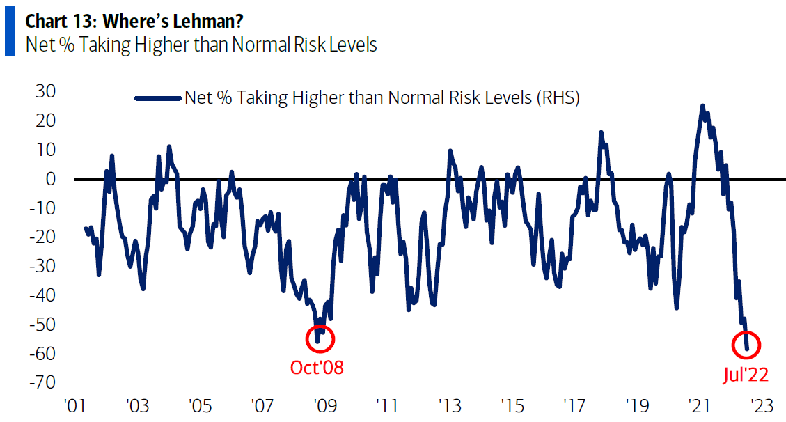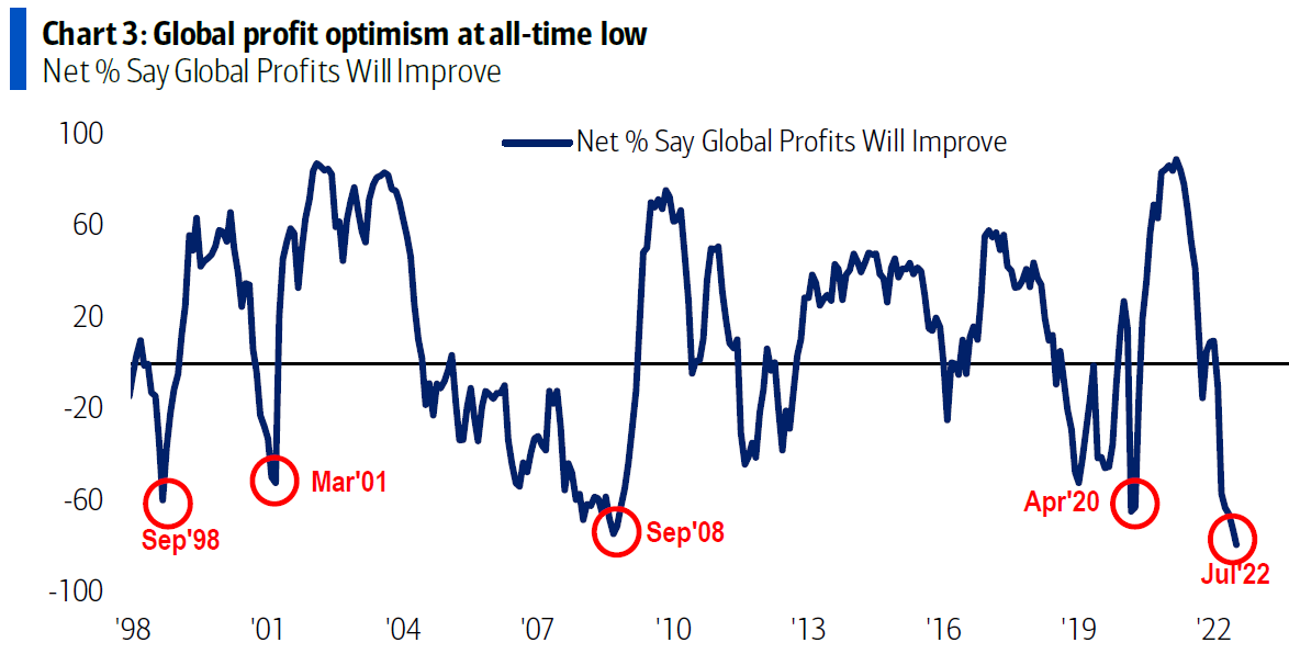 Pierwszy z wykresów wskazuje jaki procent ankietowanych uważa, że globalne zyski spółek ulegną poprawie. Ze świecą szukać dzisiaj optymistów, a zdecydowana większość obstawia pogorszenie zyskowności w najbliższej przyszłości (są to najniższe odczyty od kiedy BofA prowadzi to badanie).