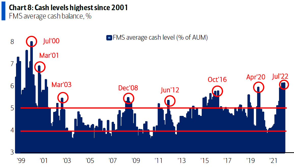 Kolejne pytanie na jakie odpowiadali zarządzający dotyczyło udziału gotówki w portfelach inwestycyjnych. Obecnie zaangażowanie w gotówkę na tle historii jest bardzo wysokie (najwyższe od 2001r). A to wskazuje na dużą niepewność co do dalszego rozwoju sytuacji.