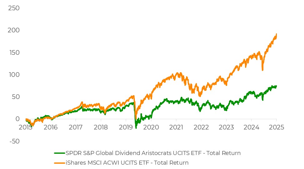 Wykres. ETF inwestujący w globalne akcje (MSCI ACWI) oraz przykładowy ETF inwestujący w spółki zaliczane do „dywidendowych arystokratów”. Total return. Zmiany w % za ostatnie 10 lat. Źródło: LSEG.