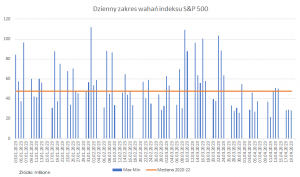 Jak więc wyglądał rynek? Spójrzmy zatem na przebieg notowań indeksu S&P 500. Poniżej na wykresie została przedstawiona różnica pomiędzy najwyższą a najniższą wartością jaką osiągnęły notowania indeksu w danym dniu sesyjnym. Widać, że w ostatnim czasie amplituda wahań osłabła, sprawiając wrażenie względnego spokoju.