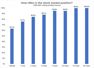 Ale czy nudne inwestowanie jest racjonalne? Okazuje się, że tak. Nie wymaga chyba dyskusji teza, że im dłuższy horyzont inwestycyjny tym większe szanse na wyższą stopę zwrotu. Idąc dalej, im rzadziej sprawdzamy stan rachunku tym lepiej dla naszych inwestycji. Poniższy wykres obrazuje jakie mamy szanse zobaczyć pozytywny wynik inwestycji w akcje w danym okresie czasu. Np. jeżeli tylko raz w roku sprawdzimy rachunek to mamy ¾ szans, że zobaczymy wyższy stan rachunku niż poprzednio.
