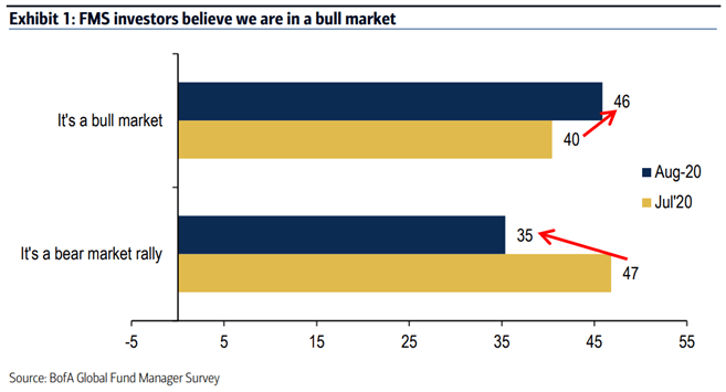 Jest to określenie, któremu najbliżej do polskiego stwierdzenia „odbicie zdechłego kota”, czyli chwilowej przerwie w trendzie spadkowym. Pomyślmy o tym chwilę – jedna trzecia światowych inwestorów uważa, że mimo tego, że rynek jest na historycznych szczytach i właśnie wzrósł kilkadziesiąt procent od dołków, to i tak wciąż jesteśmy w trendzie spadkowym. Nawet uwzględniając, że przez poprzednią dekadę nieprzerwanie światowe rynki rosły. Nie wiemy, co tymi akurat respondentami powoduje, ale brzmi to dość surrealistycznie… Dobrze, że chociaż odsetek tych osób spada (z 47% miesiąc temu).