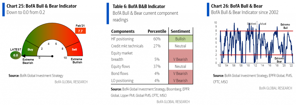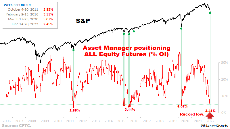 Takie coś ostatnio przydarzyło się w czasie pandemii i wygenerowało niesamowicie skuteczny sygnał kupna. Tabelka w środku pokazuje komponenty tego wskaźnika – zwracamy uwagę na wierszy „LO Positioning”, czyli pozycjonowanie funduszy typu long only (tj. tradycyjnych, które co do zasady nie grają na spadki). Tylko w 4% przypadków w historii inwestorzy ci byli bardziej defensywnie spozycjonowani. Ładnie to widać na wykresie zapożyczonym z konta @MacroCharts na twitterze: