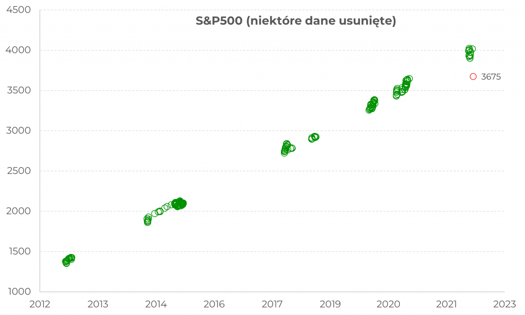 Ale to nie jest tak, że rynek akcji przestał istnieć. Dotychczasowa korekta (czy też, poprawniej, rynek niedźwiedzia) to nie jest nic nadzwyczajnego. Obrazek, który jest w tytule tego artykułu to nieco inne spojrzenie na indeks S&P500. Usunęliśmy bowiem (według pewnego numerycznego klucza) część punktów z indeksu S&P500. Zostawiliśmy natomiast piątkowy. Oto co wyszło: