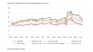 Wykres 9 pokazuje wskaźnik Cena/Zysk dla najważniejszych rynków. Linia przerywana to „przedpandemiczna” średnia dla każdego z nich.