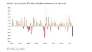 Od wielu lat, najbardziej popularnym portfelem inwestycyjnym na świecie jest portfel składający się w 60% z akcji i 40% z obligacji. Sami go zresztą stosujemy dla budowania naszej alokacji i rekomendowanych odchyleń. Niestety, minione II kwartały były jednymi z najgorszych w historii dla rozwiązań tego typu. Widać to wyraźnie na wykresie 1.