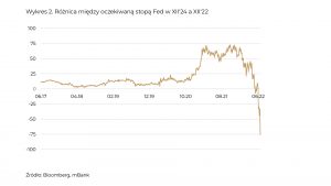 W ostatnich tygodniach zaczęło się dziać coś bardzo interesującego. Im ostrzej działały banki centralne, tym mniej dalszych podwyżek oczekiwali inwestorzy. Świetnym przykładem jest tu rynek amerykański. Obecnie stopa procentowa wynosi nieco ponad 1,5%, a w czerwcu Fed podniósł ją o niespotykane 75 punktów bazowych. Na rynku można zaobserwować, jak rynek wycenia trajektorię stóp w przyszłości. W szczególności spójrzmy na wycenę różnicy między oczekiwaniem na koniec 2024, a końcem bieżącego roku. Pokazujemy to na wykresie 2.
