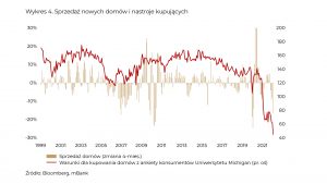 Na wykresie 4 pokazujemy również, jakie są warunki dla kupowania domów w odczuciu amerykańskich konsumentów. Jak się okazuje, tak dużego pesymizmu nie było ani po zamachach na World Trade Center, ani w czasie kryzysu w 2008 roku, ani nawet