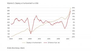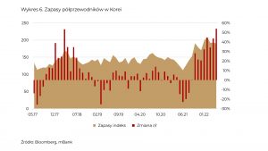 z wielkimi zapasami, których muszą się szybko pozbyć – nawet kosztem niższych cen. Wykres 5 pokazuje, jak wyglądają zapasy hurtowników w USA, a wykres 6 – jak wyglądają zapasy półprzewodników w Korei.