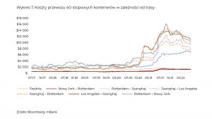 Ważną sprawą w kwestii łańcuchów dostaw są koszty przewozu. Tutaj także widać istotną poprawę, choć ciągle utrzymują się problemy. Wykres 7 pokazuje koszty przewozu 40-stopowych kontenerów na różnych trasach.