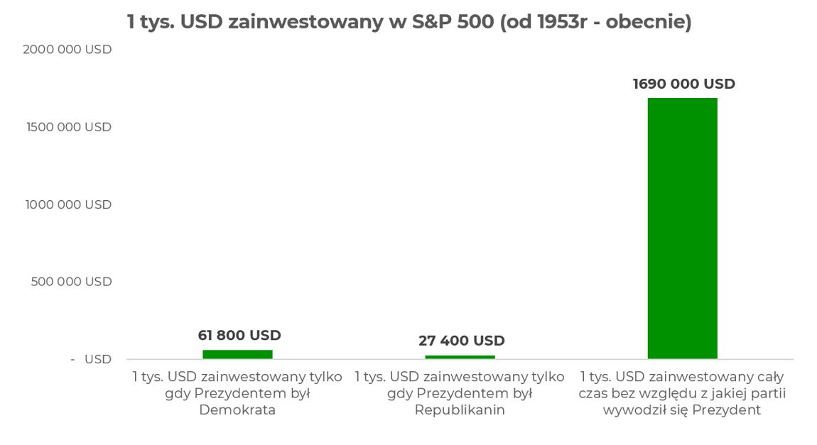 Jeszcze gorzej, jeżeli nasze preferencje wyborcze co do konkretnej partii chcemy przełożyć bardziej zdecydowanie na nasz portfel inwestycyjny np. inwestując na rynku akcji tylko gdy prezydentem jest „nasz kandydat”. Od 1951 r. indeks S&P 500 zyskiwał rocznie średnio 11,5% jeżeli w Białym Domu zasiadał Demokrata oraz 7,1% gdy prezydentem był Republikanin. Poniższy wykres (z kategorii „no nie, coś tu chyba źle zostało policzone”) zdecydowanie sugeruje, że w akcje powinniśmy inwestować bez względu na to z której partii wywodzi się prezydent.
