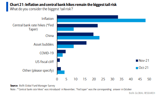 Zachowanie cen akcji spółek korzystających z pandemicznych obostrzeń jest bardzo spójne z tym, jakich ryzyk obawiali się zarządzający największymi funduszami inwestycyjnymi świata w ciągu ostatnich miesięcy. A covid od ponad pół roku nie jest już wymieniany w gronie największych bolączek. W ostatnich ankietach przeprowadzanych przez Bank of America niewielki odsetek ankietowanych wskazywał właśnie na COVID-19 jako największe ryzyko dla rynków, a na ustach wszystkich niezmiennie od kilku miesięcy znajduje się inflacja: