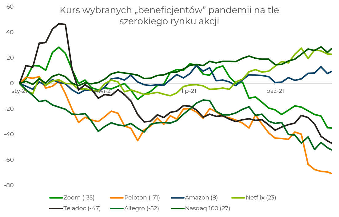 Dlaczego uważamy, że rynki w coraz mniejszym stopniu obawiały się pandemii? Rzut oka na zachowanie kursów akcji największych beneficjentów pandemii w porównaniu do szerokiego rynku akcji nie pozostawia złudzeń. Mimo cały czas bardzo dobrych wyników finansowych, nawet na tle niezwykle wymagającej bazy z 2020 roku, koszyk zwycięzców z 2020 r. zachowuje się w ciągu ostatniego roku słabo. Doskonałym przykładem jest tutaj spółka Zoom Video Communications, której kurs „przepołowił się” od zeszłorocznych szczytów. W wielu przypadkach wyceny pospadały wręcz do poziomów niższych niż przed pandemią. Dlaczego tak się stało? Wydaje się, że rynek poważnie obawia się tempa wzrostu tych spółek w świecie „po pandemii”. A nie powrotu pandemii.