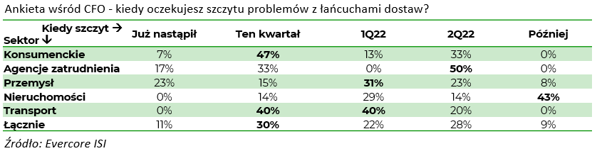 Zacznijmy od początku, czyli od łańcuchów dostaw. To niewątpliwie złożona sytuacja i ciężko o jednoznaczne odpowiedzi. Niemniej szukając optymistycznych akcentów, można zwrócić się do osób, które powinny relatywnie najszybciej dostrzegać poprawę, czyli do dyrektorów finansowych firm. Ci pytani, kiedy oczekują szczytu problemów z łańcuchami dostaw wskazują w większości na ten, ewentualnie następny kwartał, a bardzo rzadko na odleglejszą przyszłość. Co jeżeli mają rację? Przede wszystkim być może obawy inflacyjne rynków okażą się na wyrost, co będzie miało istotny wpływ na pozycjonowanie na rynku akcji i obligacji.