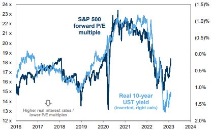 Temat wycen jest zdecydowanie bardziej skomplikowany niż mogłoby się wydawać. Jak to możliwe, że czasami C/Z jest na poziomie 20 i inwestorzy akceptują takie poziomy, kupują akcje i rynek jest w stanie rosnąć kilkadziesiąt procent, a czasami C/Z szoruje po dnie i nikt ani myśli dotykać rynku akcji, który potrafi jeszcze bardziej się przeceniać? W dużej mierze determinowane jest to przez otoczenie rynkowe i alternatywy dla rynku akcji. W otoczeniu niskich stóp procentowych i niskich rentowności obligacji inwestorzy są w stanie zaakceptować wysokie wyceny (tak jak w 2020 i 2021r). W sytuacji odwrotnej, gdy stopy procentowe i rynek długu są coraz bardziej atrakcyjne, wyceny spadają. Nieco bardziej zaawansowane podejście sugeruje również uwzględniać oczekiwaną inflację i porównywać C/Z z realnymi rentownościami. Jak widać na poniższym wykresie im wyższe realne rentowności (prawa oś, skala odwrócona), tym niższe wyceny rynkowe. Zależność ta sprawdzała się także w ostatnich kwartałach i tłumaczy skąd niższe odczyty C/Z w minionym roku.