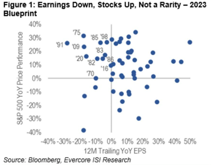 Jednak nawet w takim otoczeniu notowania akcji wcale nie muszą spadać. Co widać powyżej, wiele lat (kropek) znajduje się w lewej górnej części wykresu, co oznacza okresy , gdy obserwowaliśmy spadek EPS-ów (zysków na akcje), zaś indeks S&P500 osiągał dodatnią stopę zwrotu.
