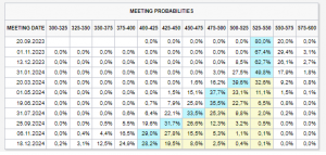 Podobne wnioski płyną z danych CME FedWatch Tool gdzie najbardziej prawdopodobnym scenariuszem jest brak podwyżek w tym roku. Jeszcze na początku tygodnia brak zmian w listopadzie i w grudniu zakładany był z prawdopodobieństwem ponad 60% a pierwsza obniżka była najbardziej prawdopodobna w marcu 2024 r. Obecnie, po lipcowym posiedzeniu, rynek dalej nie spodziewa się już podwyżek, a oczekiwania co do pierwszej obniżki coraz bardziej przesuwają się z marca 2024, na maj 2024.