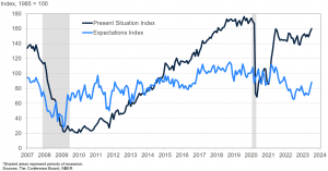 Ku zaskoczeniu wielu gospodarka daje sobie radę. Prognozy wskazują na 1,8% wzrost PKB w tym roku. Bezrobocie na historycznych minimach w okolicy 3,6% w połączeniu z większym od oczekiwań spadkiem cen konsumentów napawa optymizmem. Najbardziej wrażliwy na wysokość stóp procentowych sektor budowlany ustabilizował się a sentyment wśród ankietowanych w czerwcu przedstawicieli budowlanki wzrósł do poziomu najwyższego od 13 miesięcy. Konsument? Też czuje się coraz lepiej. Indeks zaufania konsumentów Conference Board® wzrósł w lipcu do 117,0 (1985=100), w porównaniu ze 110,1 w czerwcu. Wskaźnik Obecnej Sytuacji — oparty na ocenie konsumentów dotyczącej bieżących warunków biznesowych i warunków na rynku pracy — wzrósł do 160,0 (1985=100) z 155,3 w zeszłym miesiącu. Indeks Oczekiwań — oparty na krótkoterminowych perspektywach konsumentów dotyczących dochodów, biznesu i sytuacji na rynku pracy — wzrósł do 88,3 (1985=100) z 79,3 w czerwcu. Dla ścisłości należy dodać, że odczyt powyżej 80 pkt oznacza, że konsumenci już nie spodziewają się recesji w ciągu następnego roku.