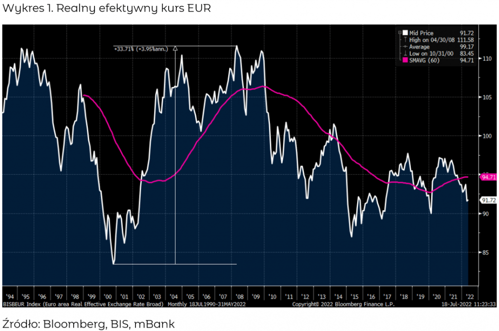 Ekonomiści często posługują się miarą „realnego efektywnego kursu walutowego”. Oznacza to, że mierzymy wartość danej waluty w odniesieniu do koszyka innych walut (najczęściej największych partnerów handlowych) oraz uwzględniając inflację. Co prawda euro nie istniało w latach 90-tych, ale można sobie zrobić scenariusz „co by było gdyby” używając wag walut poszczególnych krajów (głównie marki i franka). Bank Rozrachunków Międzynarodowych w Bazylei publikuje takie wyliczenia i prezentujemy je na wykresie poniżej dodając 5-letnią średnią kroczącą