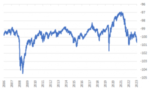 Zacieśnienie polityki kredytowej przez banki trwa w najlepsze. W rezultacie akcja kredytowa dla firm mocno spowalnia co może zakłócić procesy inwestycyjne w przedsiębiorstwach, czyli osłabić jeden z filarów stojących za miękkim lądowaniem światowej gospodarki. Idąc dalej w tym kierunku widzimy rosnącą liczbę bankructw oraz niewypłacalności obligacji korporacyjnych, czego tak naprawdę jeszcze zdaje się nie dostrzegać rynek obligacji typu high yield, oferując nieadekwatnie niską premię za ryzyko.