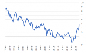 Przy tak wysokim koszcie kredytu nie bezpodstawne są obawy, że coś musi pęknąć. Czy będzie to amerykański konsument, któremu kończą się pocovidowe oszczędności, oprocentowanie kredytów hipotecznych przebiło 8% a kredyty konsumpcyjne (oparte o zmienną stopę) wymuszają coraz większe raty? Już teraz widać narastający problem ze spłatą pożyczek zaciągniętych na zakup samochodów. Według agencji Fitch Ratings odsetek spłat rat opóźnionych o 60 dni wyniósł 6,11% we wrześniu i był najwyższy od 1994 r. Inne dane z gospodarki jednak nie wskazują jednoznacznie w tym kierunku. Sprzedaż detaliczna się nie załamała, większość kredytów hipotecznych jest na stałej stopie, dużo poniżej obecnych wartości, a nadwyżki w budżecie można zainwestować w bezpieczne bony skarbowe przynoszące ponad 5% stopę zwrotu.
