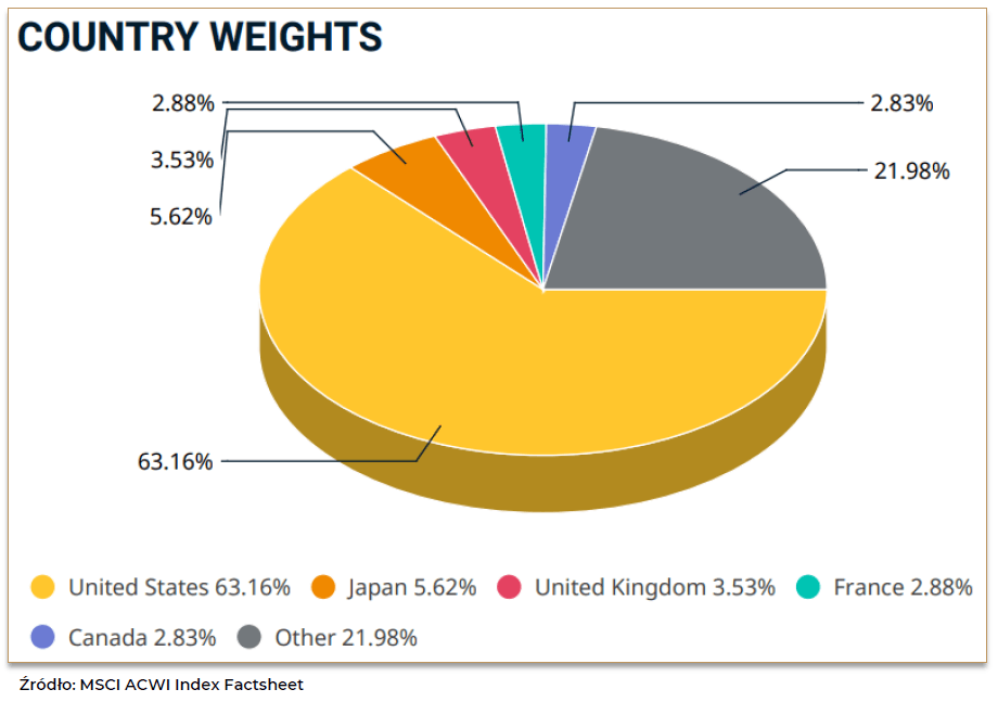 Zanim jednak rozgrzejemy swoje inwestycyjne oczekiwania wobec Japonii pamiętajmy jak zwykle o właściwej dywersyfikacji naszego portfela inwestycyjnego. Spójrzmy na geograficzny skład globalnego indeksu akcji MSCI All Country World Index. Możemy zauważyć, że Japonii jako elementu w globalnej finansowej układance jest niespełna 6%.