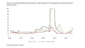 To naprawdę bardzo dużo, a trend jest wyraźnie wzrostowy. Na wykresie pokazujemy też Chiny – tam ryzyko recesji rozumianej jako spadek PKB jest dość niewielkie, ze względu na centralnie planowany charakter gospodarki. Zwróćmy uwagę, że Chiny nie wpadły