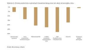 - Półprzewodniki – jeden z najlepszych sektorów na rynkach akcji w minionym roku zachowuje się obecnie bardzo słabo. Indeks spółek związanych z sektorem półprzewodników bardzo znacząco spadł, a jest to sektor bardzo cykliczny, czyli wyjątkowo wrażliwy na zmiany oczekiwanego tempa wzrostu gospodarczego.
