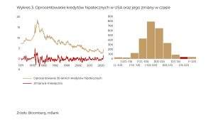 Lewa część to oprocentowanie 30-letnich kredytów hipotecznych oraz zmiana za ostatnie 6-miesięcy. Po prawej stronie rozkład owych zmian na przestrzeni ostatnich kilkudziesięciu lat z zaznaczonym ostatnim okresem. Okolice 5% to historycznie nie jest może coś nadzwyczajnego, ale tempo wzrostu robi wrażenie. Szczęśliwie dla Amerykanów rynek kredytów hipotecznych od zawsze oparty jest na stałej stopie procentowej, co oznacza, że ci, którzy zaciągnęli je w ostatnich latach będą płacili nadal tyle samo.
