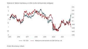 Na domiar złego, wysokie stopy procentowe nie cieszą już nawet te sektory, które tradycyjnie na nich zyskują. Spójrzmy na wykres siły relatywnej banków do S&P 500 na tle rentowności obligacji 10-letnich.