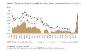W tym kontekście na koniec spójrzmy na przykład polskiego rynku długu. Gwałtowne podwyżki stóp procentowych i jastrzębia retoryka prezesa Glapińskiego sprawiły, że rynek wycenia, że stopy procentowe latem przekroczą 6%. Widać to w rentownościach obligacji, które tak wysokie nie były od czasów Wielkiego Kryzysu Finansowego w 2008 roku. Co ciekawe, ze względu na potężne ilości pieniądza wtłoczone w ostatnich latach do systemu bankowego, oprocentowanie lokat bankowych wciąż jest bardzo niskie. Różnicę tę pokazujemy na wykresie poniżej.