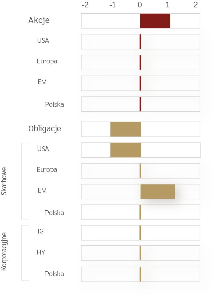 Od dłuższego czasu utrzymujemy przeważenie na rynkach akcji i jak na razie nie widzimy powodów do zmiany. Dla przypomnienia, nasza aktualna taktyczna alokacja przedstawiona jest poniżej.