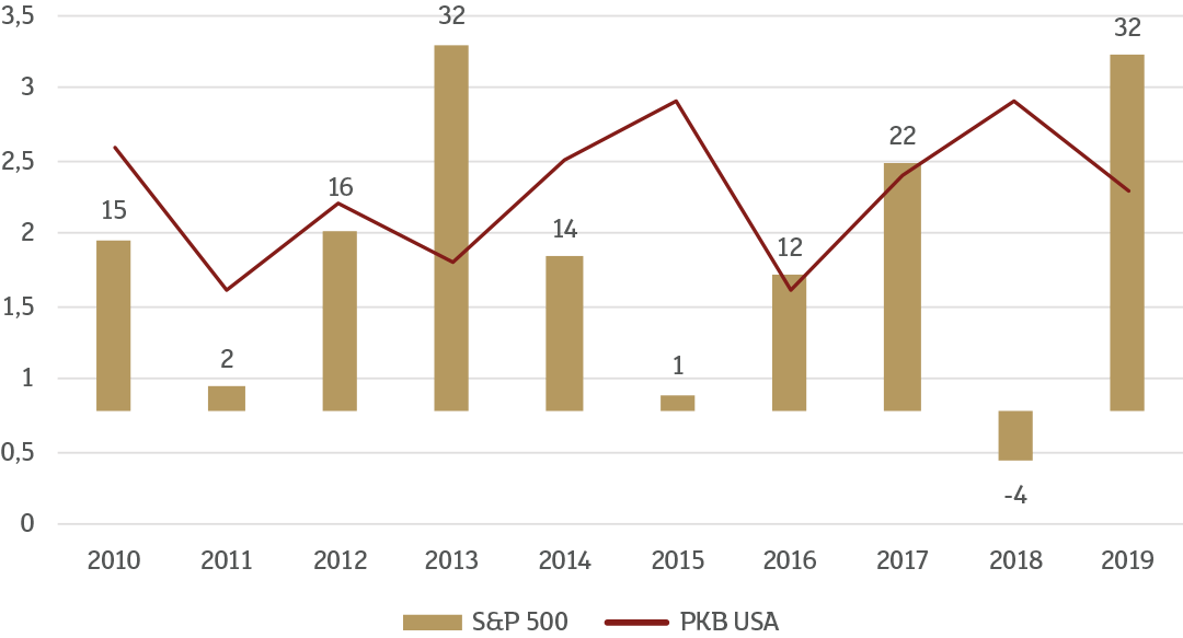 Zestawiamy na nim roczne tempo wzrostu gospodarczego w USA z wynikami indeksu S&P500 w ostatniej dekadzie. Jak widać, lata z najwyższym tempem wzrostu gospodarczego, czyli 2015 i 2018 były jednocześnie najgorszymi okresami dla nowojorskiej giełdy.